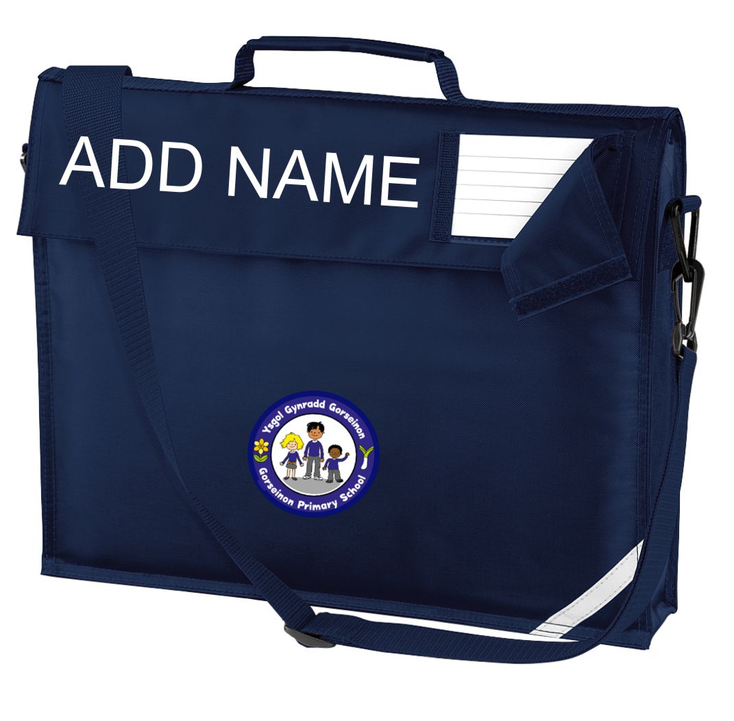 Gorseinon primary school book bag with strap with Gorseinon school logo embroidered on the front and the child's name printed on the top.