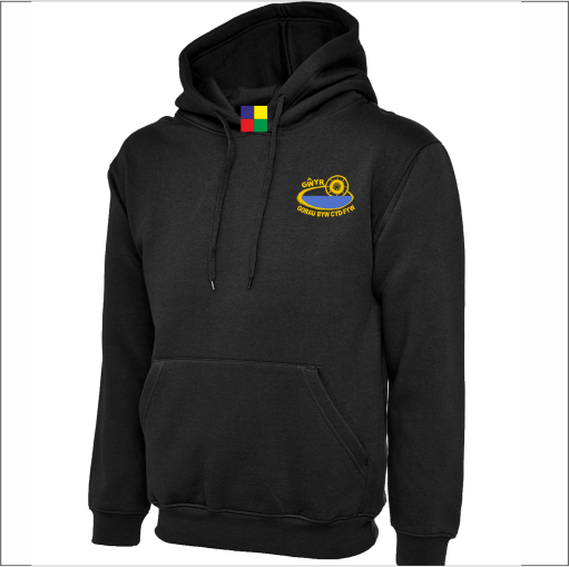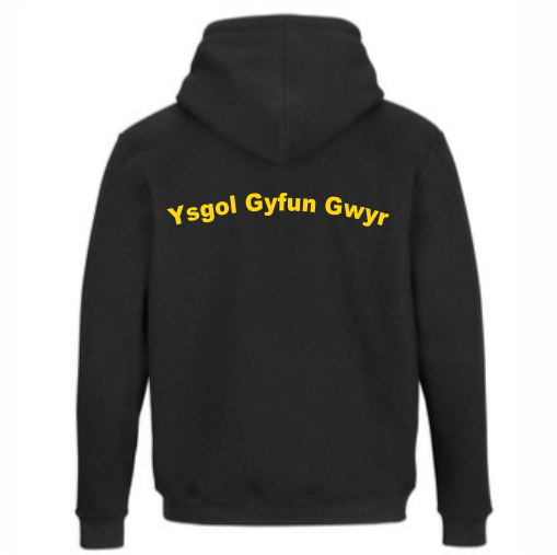 Gwyr comprehensive school hooded sweatshirt with gwyr school uniform logo embroidered on the left front. On the back is the school name printed in golden yellow vinyl.