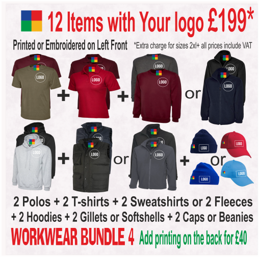 A choice of 2 T-shirts plus 2 Polos plus 2 Sweatshirts or 2 Fleeces plus 2 Hoodies plus 2 Gillet or softshell jacket, 2 Beanies or Caps.